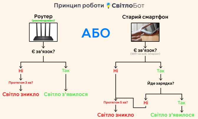 Для роботи бота потрібен роутер або старий смартфон. Увімкнувши вдома або в офісі в розетку на зарядку старенький або непотрібний смартфон чи планшет (android) та налаштувавши його згідно з інструкцією, ви зможете отримувати сповіщення у свій створений телеграм-канал повідомлення про наявність/відсутність світла на підставі того, йде зарядка цього смартфону чи ні.