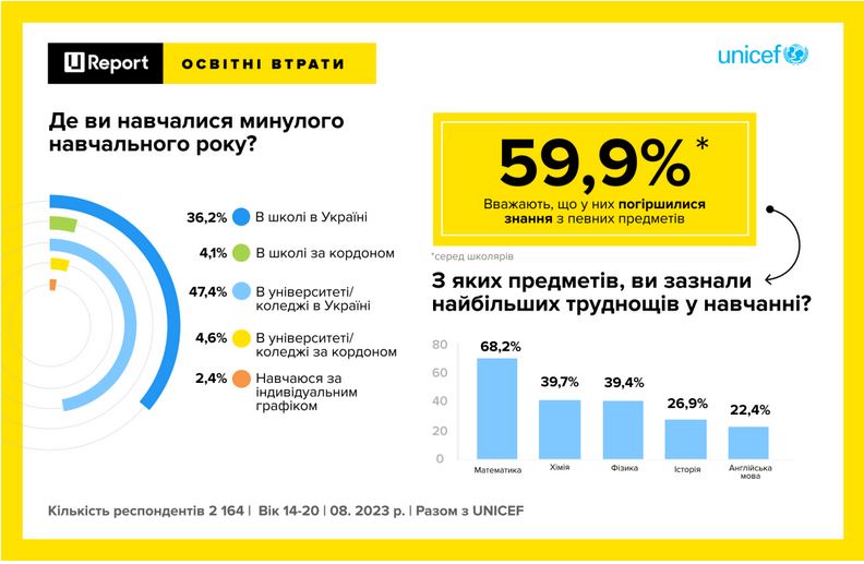 Опитування щодо втрат у навчанні проводилося онлайн на платформі U-Report з 5 по 14 серпня 2023 року. У ньому взяли участь 2 164 респонденти в Україні та за кордоном віком від 14 до 20 років.