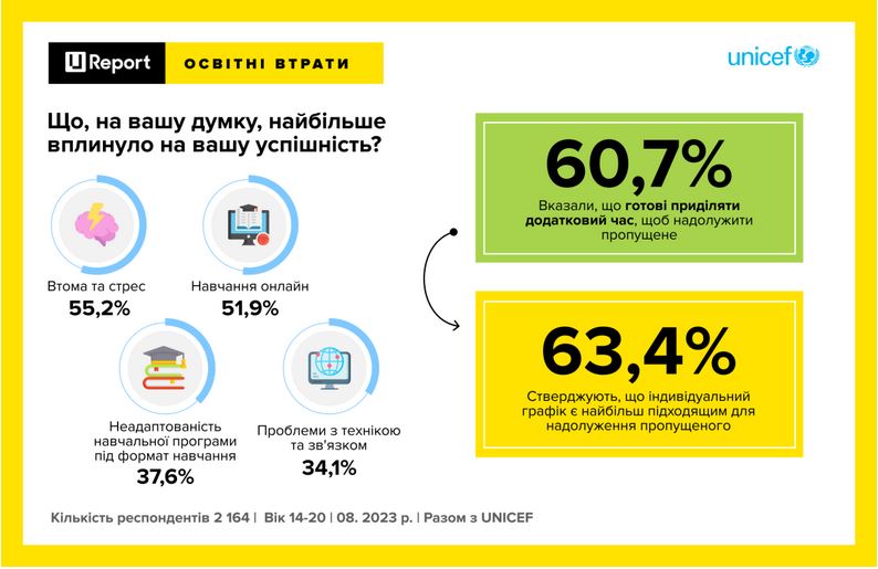 Як свідчать результати опитування ЮНІСЕФ, проведеного через U-Report напередодні нового навчального року, близько 60% підлітків та молоді прагнуть надолужити втрачені через війну знання. U-Report — це глобальний інструмент, розроблений ЮНІСЕФ, який використовується для залучення підлітків, молоді та громадськості. Він допомагає зібрати думки молоді, щоб вдосконалити політику та програми, спрямовані на задоволення їхніх потреб.