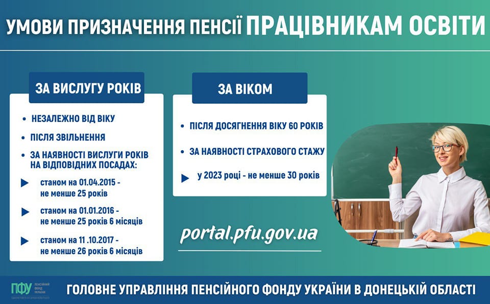 Про умови призначення пенсій працівникам закладів освіти розповіли у Головному управлінні Пенсійного фонду України в Донецькій області. Право на призначення пенсії за віком після досягнення віку 60 років мають особи за наявності страхового стажу, пише Інформатор.