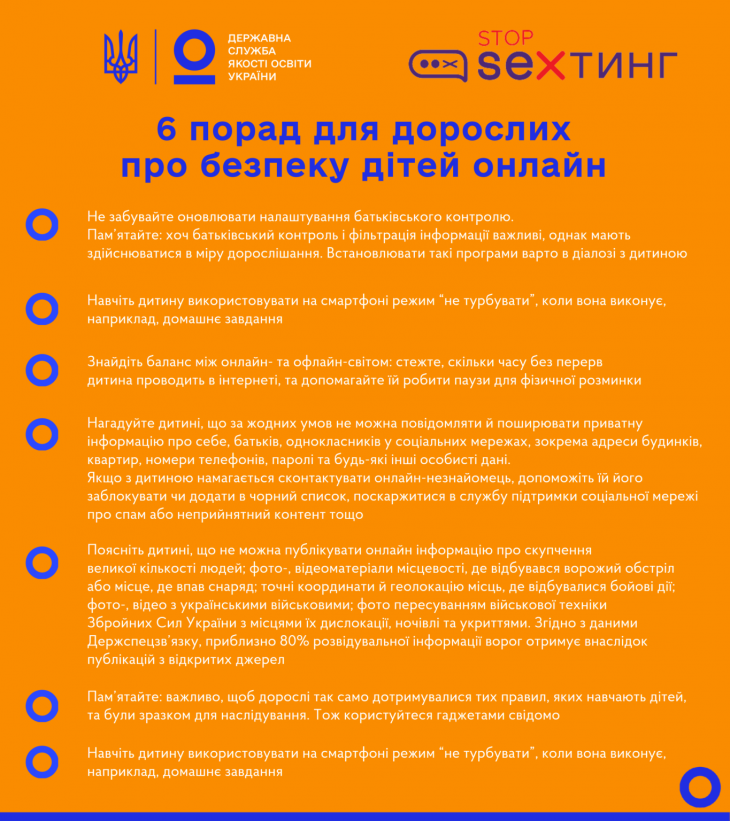 Фахівці освітнього проєкту #stop_sexтинг сформулювали шість головних порад як зменшити загрози для дитини в кіберпросторі: