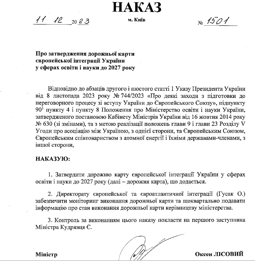 Згідно з наказом, Директорат європейської та євроатлантичної інтеграції МОН має забезпечити моніторинг виконання дорожньої карти та щоквартально подавати інформацію про стан справ керівництву міністерства.