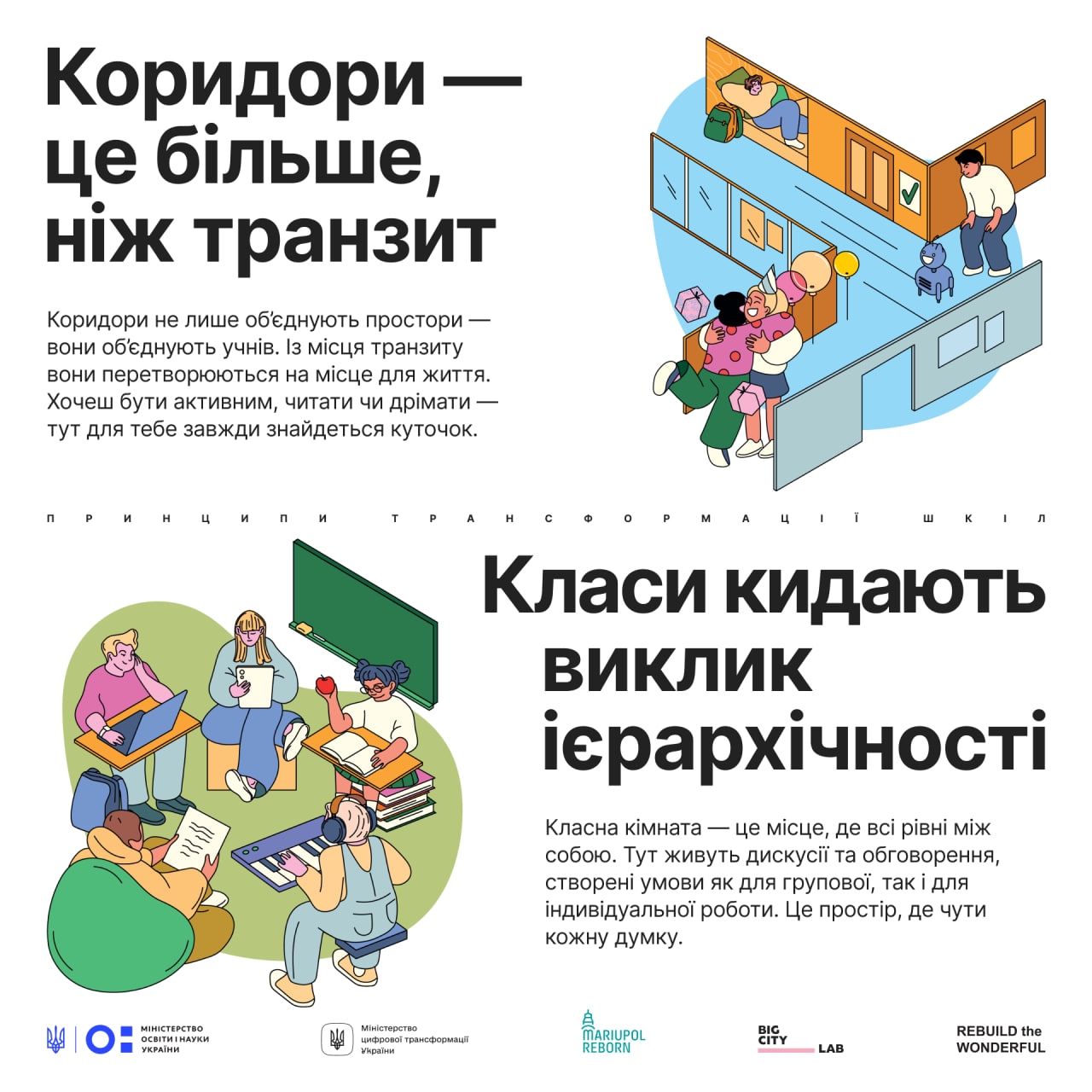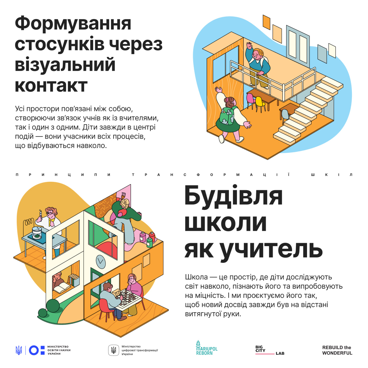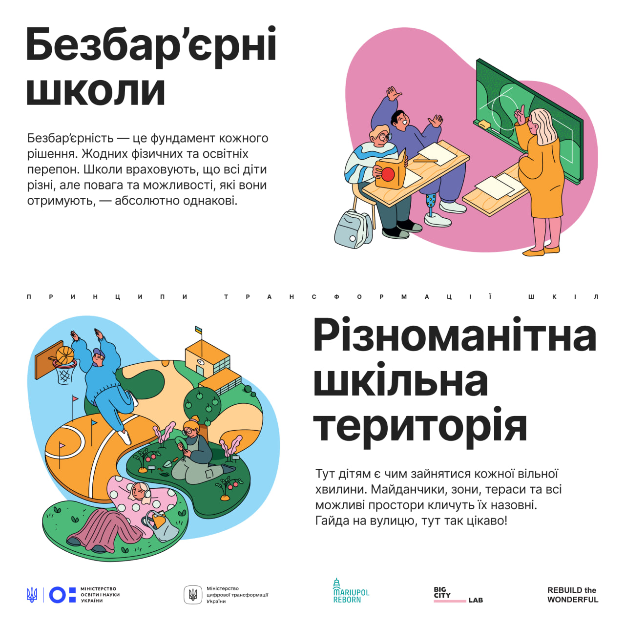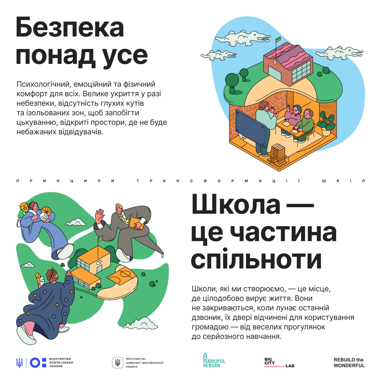 «Безпека — комфортне укриття, у якому можна не лише пересидіти тривогу, а й продовжити навчання за потреби; школи без темних закутків, щоб запобігти булінгу. Безбар’єрність має стати новою нормою, враховуючи те, скільки людей отримують поранення та інвалідність під час війни. Школи як частина спільноти — вони будуть першими на відбудову: у деокупованих містах та селах потрібна інфраструктура для якісного життя, яку може вмістити в собі приміщення школи, стаючи місцем для громади. Різноманітна шкільна територія — час поза уроками не менш важливий, аніж час, який діти проводять за навчанням, а школа — це про соціалізацію, вибудовування власних та чужих кордонів, дорослішання, розуміння світу навколо. Завдяки цим підходам ми перетворюємо непрацюючий старий простір у новий, функціональний, та виправляємо головні недоліки минулого», - зауважила Вікторія Тітова, СЕО Big City Lab.