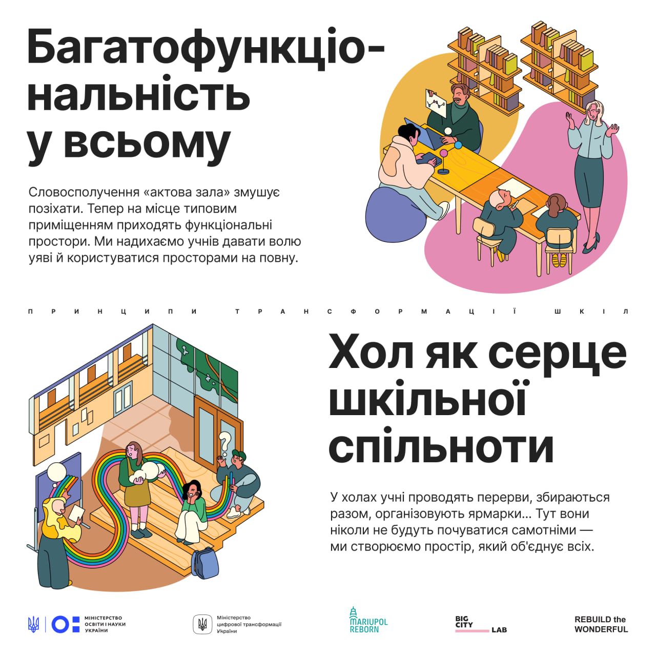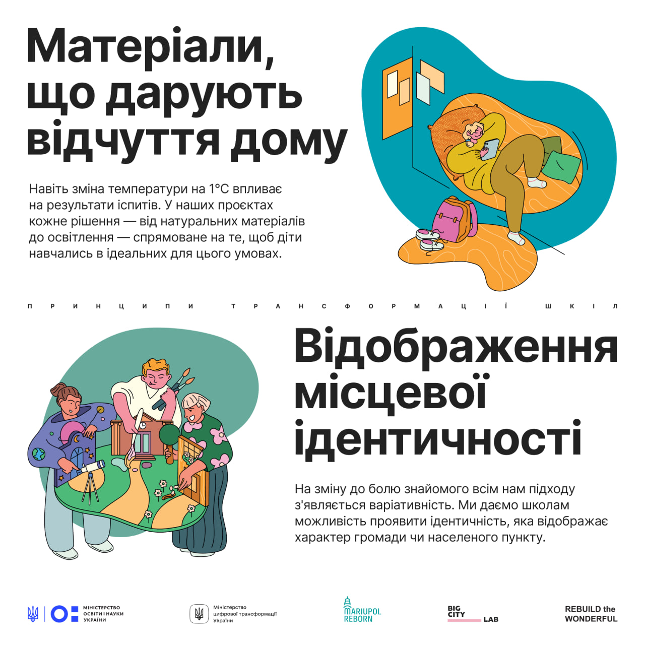 «Школа — це не просто будівля, це простір, у якому формується майбутнє. Великою мірою, який простір, таке і майбутнє. Більшість шкіл в Україні — це типові радянські рішення, головним завданням яких були не розвиток і реалізація кожної дитини, а обслуговування радянської тоталітарної системи. Ми хочемо, щоб в Україні були європейські шкільні простори: естетичні, інклюзивні, сучасні, які б були створені для спілкування, спільного творення, взаємодії. Тому «Маріуполь Реборн» профінансував розроблення концепцій перетворення 5 типових радянських шкіл на сучасні демократичні освітні простори. На основі цих концепцій можна буде трансформувати тисячі шкіл по всій Україні. Принципи трансформації, які сформулювали під час розроблення концепцій, відображають сучасне уявлення про гарні школи. І ці принципи — універсальні. Команда «Маріуполь Реборн» горда бути партнером держави у такому важливому проєкті», — зауважила Наталя Ємченко, членкиня Наглядової ради «Маріуполь Реборн», директорка з комунікацій SCM.