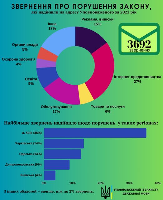 У 2023 році на адресу Уповноваженого із захисту державної мови надійшло 3692 звернення громадян про порушення Закону України «Про забезпечення функціонування української мови як державної». Це найбільша кількість скарг за всі роки існування інституту Уповноваженого і на 30% більше, ніж у 2022 році (2846).