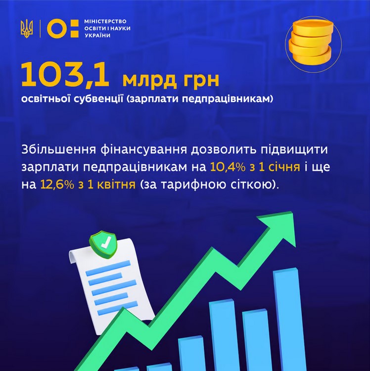 За даними відомства, загалом на наступний рік на освіту закладено фінансування майже на 22% більше проти цього року — 171,2 млрд грн. Із цього обсягу — 111,8 млрд — виключно на середню освіту. 103,1 млрд грн — за заробітні плати освітянам.