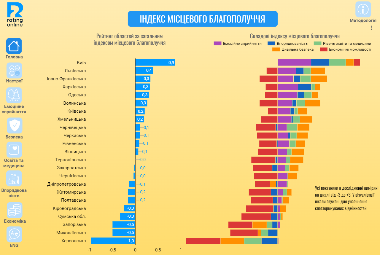 Так, перше місце в списку областей впевнено посідає столиця — Київ (0,9 бала за шкалою від -3 до +3). За ним слідкують Львівська (0.4), Івано-Франківська (0.3), Харківська (0.3), Одеська (0.3), Волинська (0.3), Київська (0.2) та Хмельницька (0.2) області.