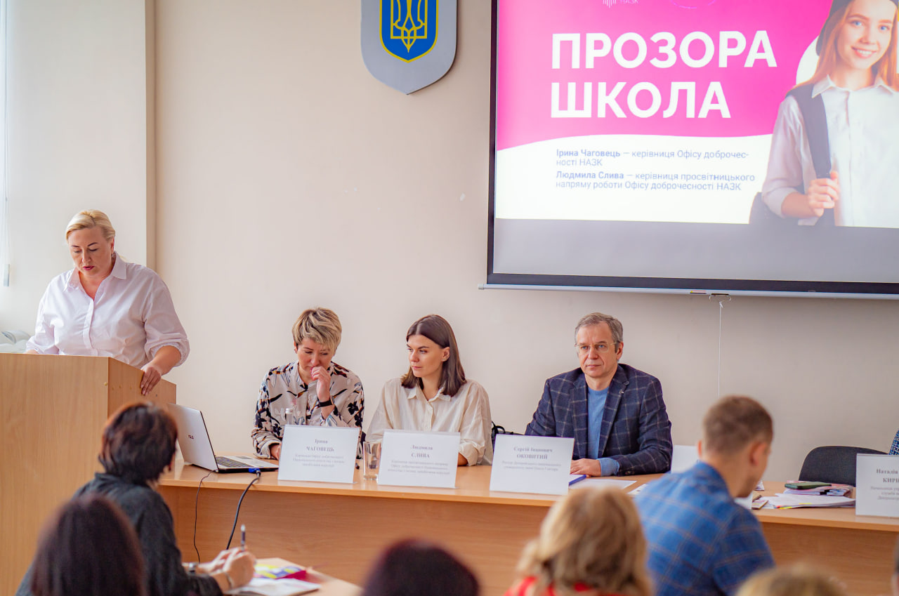 Керівниця Офісу доброчесності НАЗК Ірина Чаговець та керівниця просвітницького напряму роботи Офісу Людмила Слива презентували очільникам 86 об’єднаних територіальних громад Дніпропетровщини апробовану національну платформу формального та неформального навчання «Прозора школа», ігрові матеріали, мультсеріал «Путівник доброчесного вчителя», збірку методичних рекомендацій «Освітній навігатор», які сприятимуть формуванню ціннісних орієнтирів у школярів.