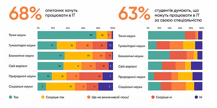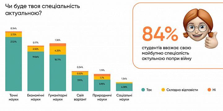 84% студентів вважає свою майбутню спеціальність актуальною попри війну. Найбільше в цьому переконані ті, хто здобуває освіту у точних та економічних науках.