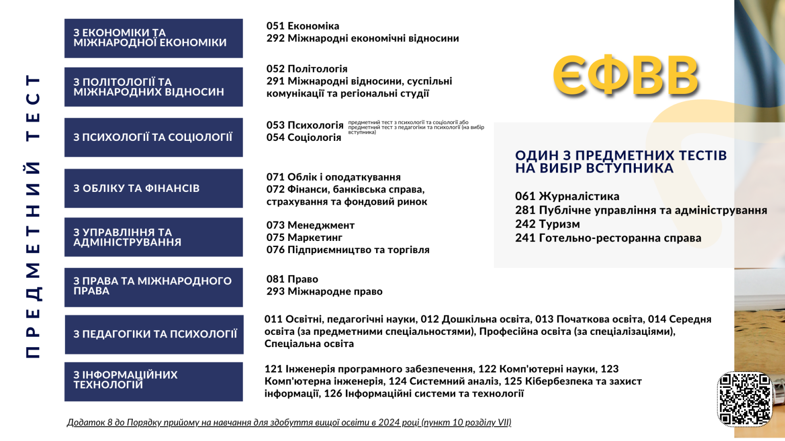 Зауважимо: Порядком визначено, що для вступу на магістерські програми 06 «Журналістика», 24 «Сфера обслуговування», 281 «Публічне управління та адміністрування» вступник може вибрати будь-який тест із переліку предметних тестів ЄФВВ ー за власним бажанням.