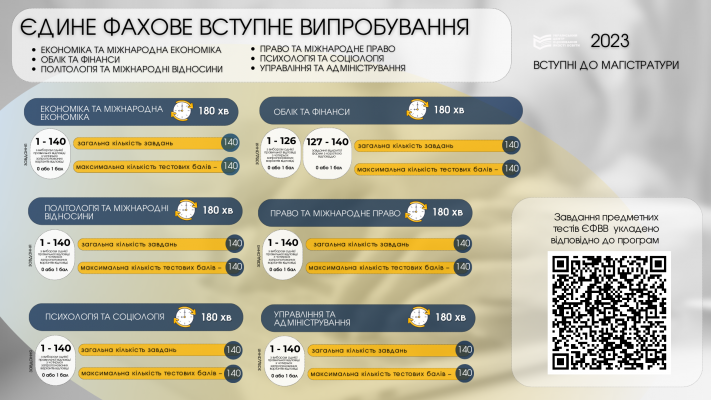 Нагадуємо: цьогоріч результати ЄФВВ потрібні для вступу до магістратури на спеціальності галузей знань 05 «Соціальні та поведінкові науки», 07 «Управління та адміністрування», 08 «Право», 28 «Публічне управління та адміністрування», 29 «Міжнародні відносини». Нещодавно ми пояснили, які саме предметні тести ЄФВВ слід вибирати під час реєстрації. Охочим вступати на кілька спеціальностей галузей знань варто пам’ятати, що не можна вибирати більше двох предметних тестів ЄФВВ.