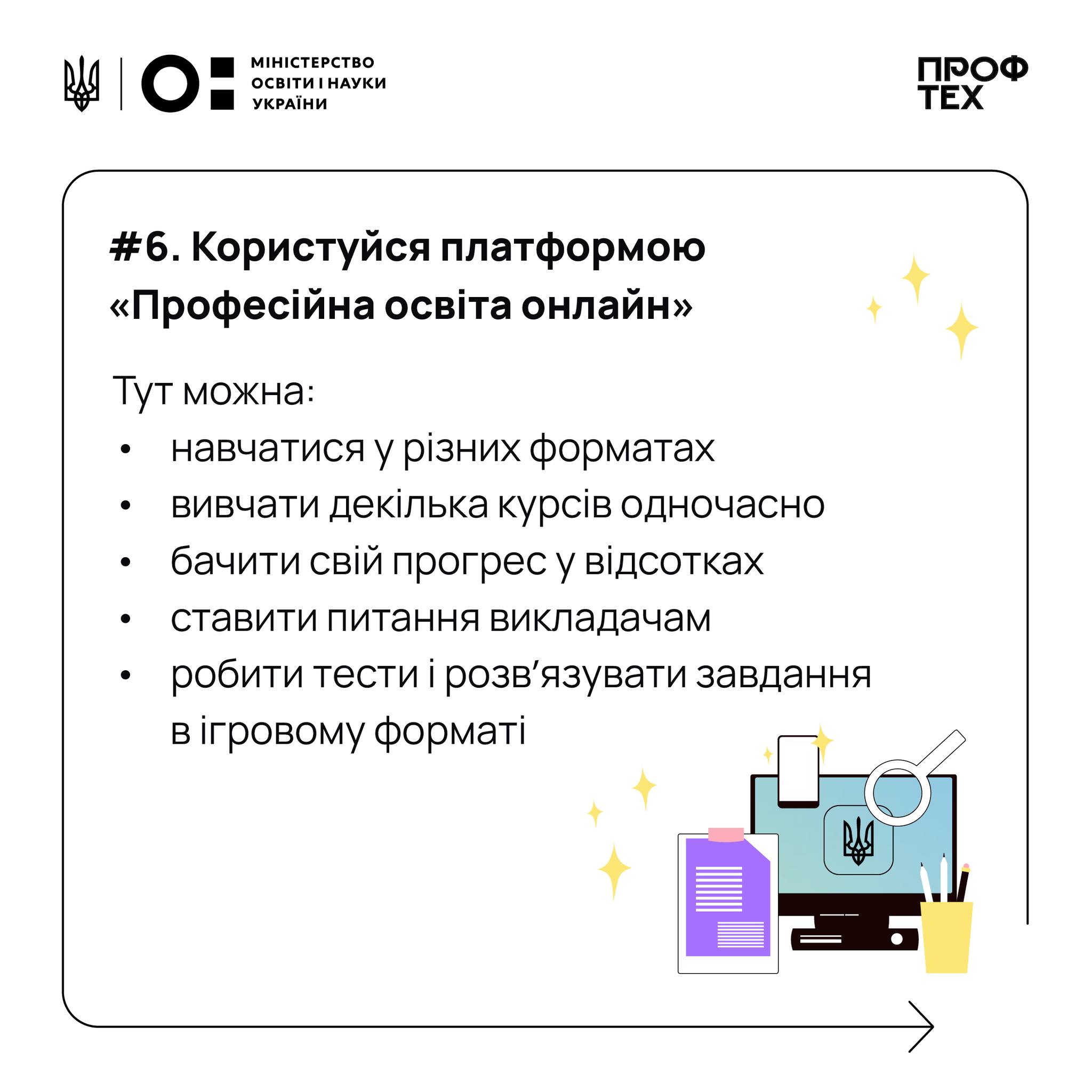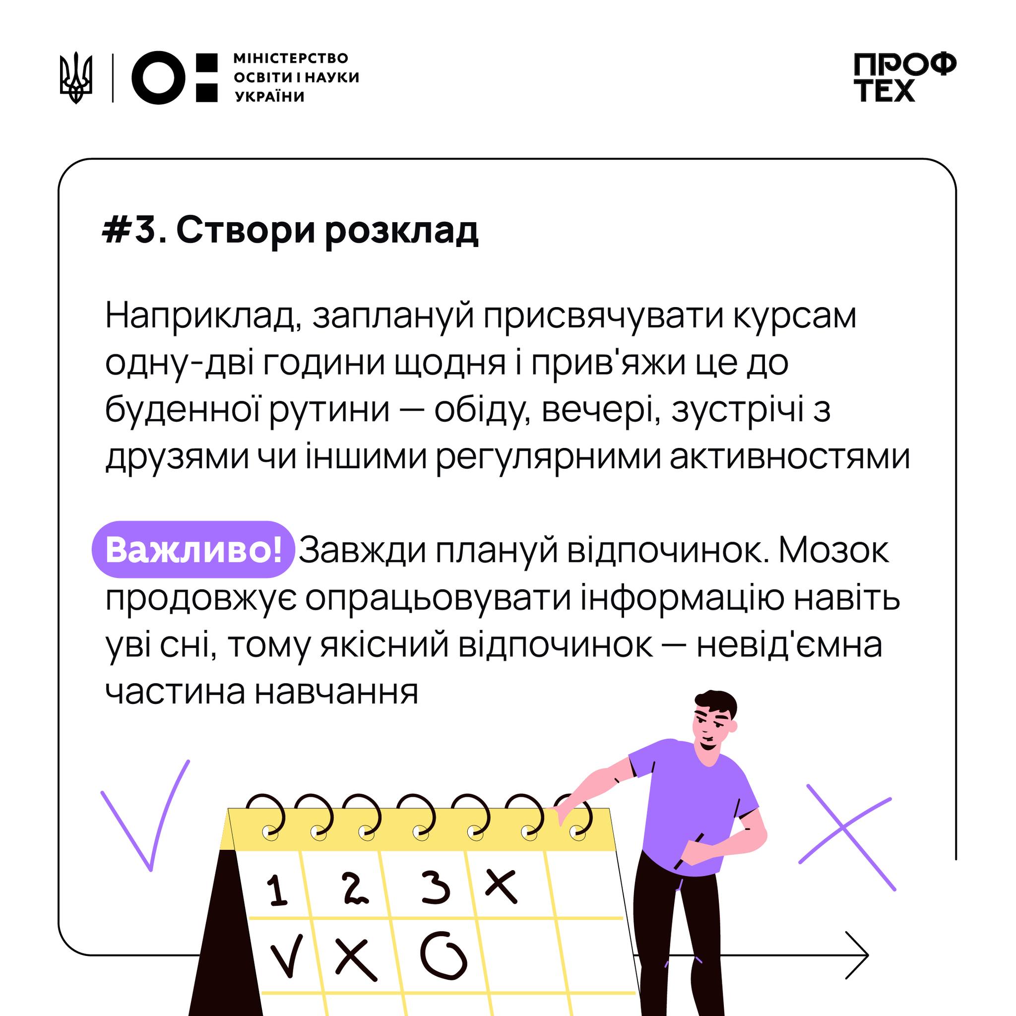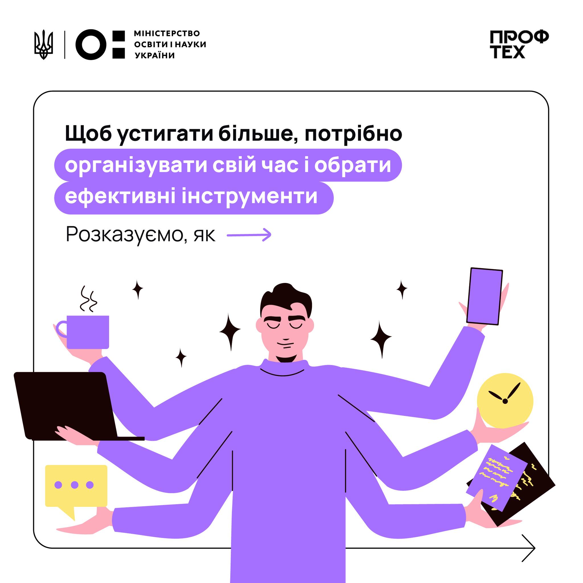 Під час освітнього процесу більшість учнів стикається з проблемою браку часу, коли хочеш встигнути й поспілкуватися з друзями, подивитися цікавий фільм, висипатися й водночас добре навчатися. Міністерство освіти і науки України підготувало 6 ефективних порад, як учитися у профтесі, аби це було легко й ефективно, що подані в зручній інфографіці.