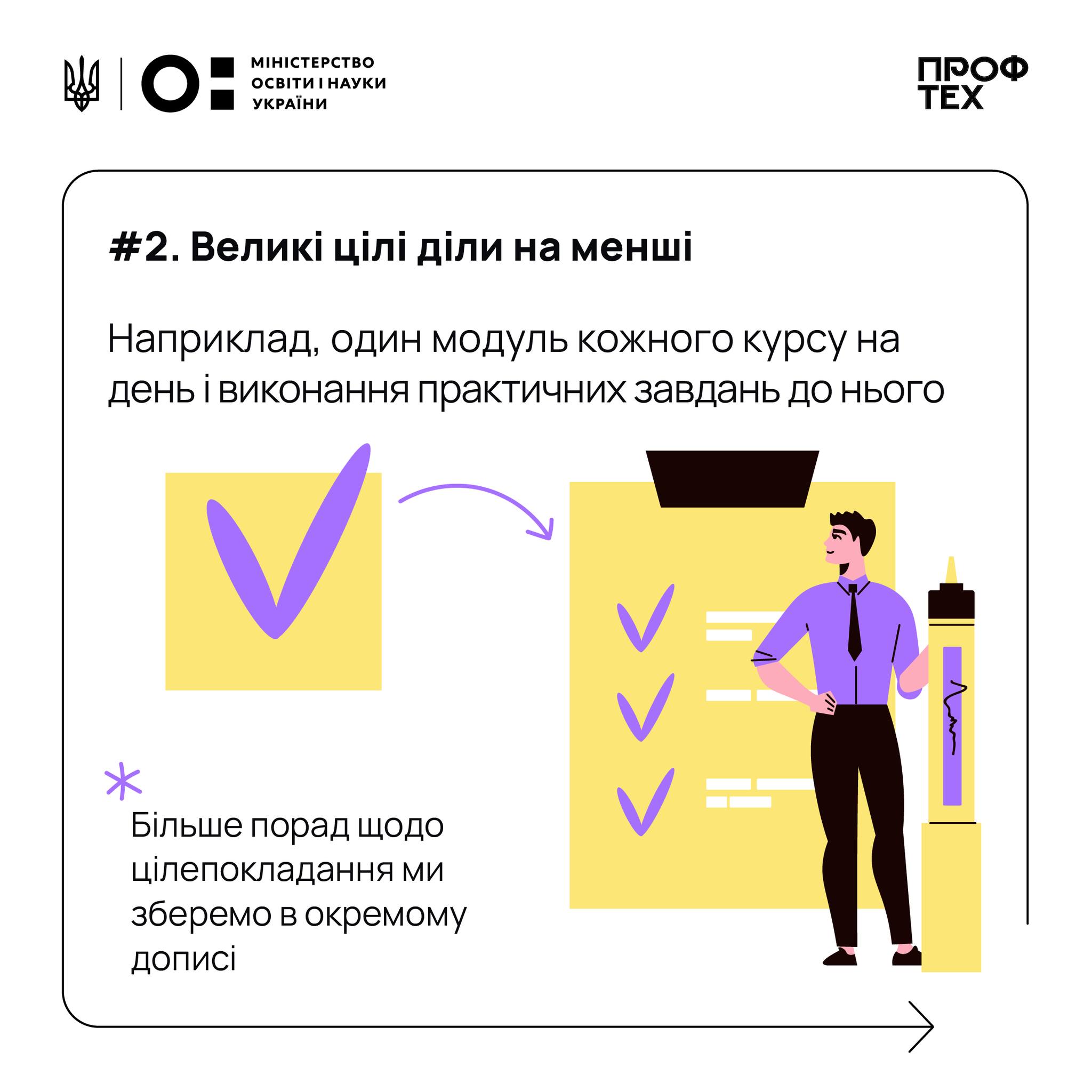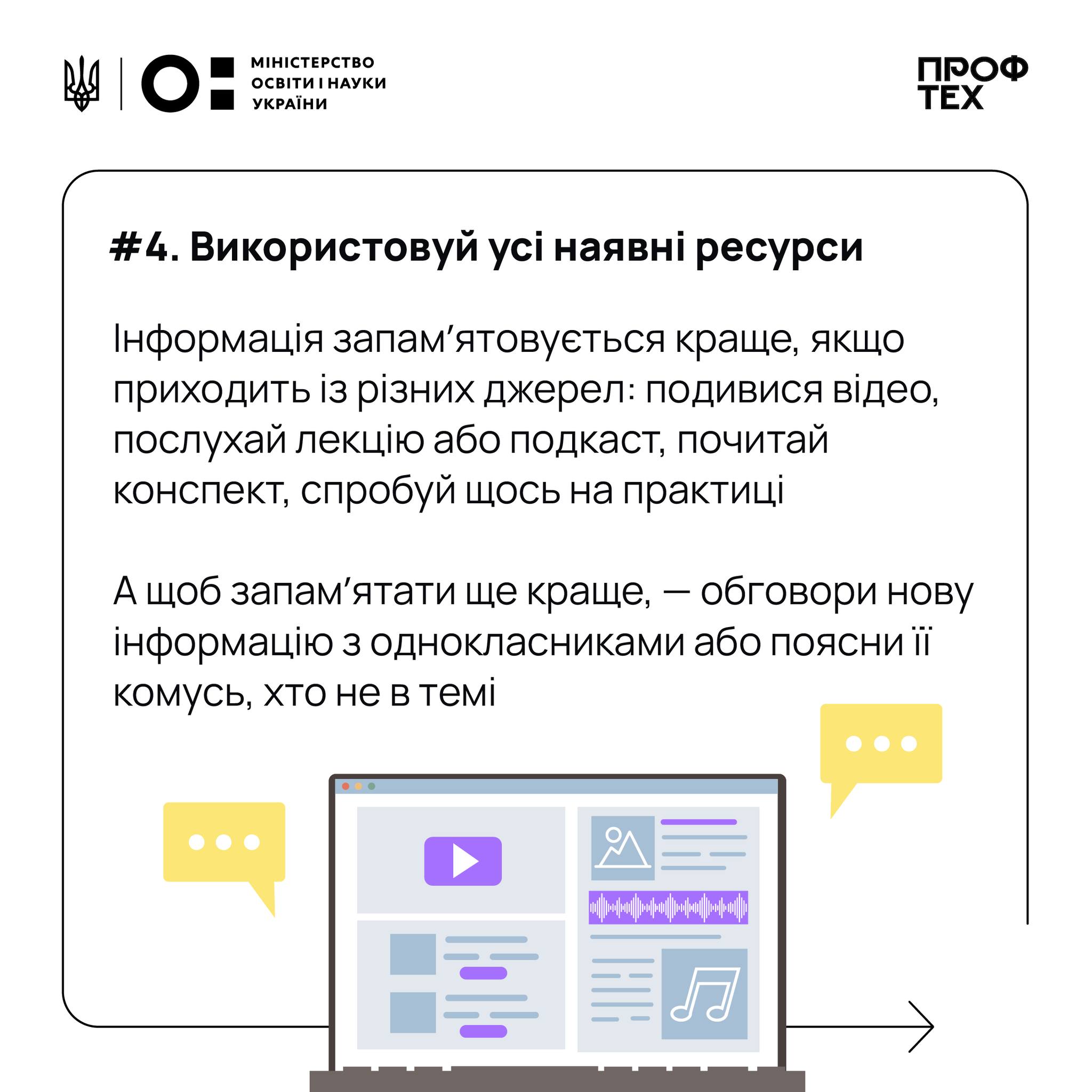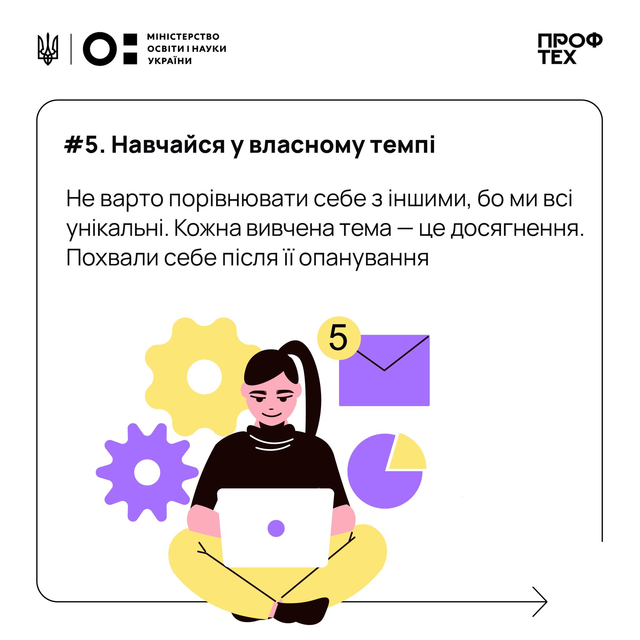 Під час освітнього процесу більшість учнів стикається з проблемою браку часу, коли хочеш встигнути й поспілкуватися з друзями, подивитися цікавий фільм, висипатися й водночас добре навчатися. Міністерство освіти і науки України підготувало 6 ефективних порад, як учитися у профтесі, аби це було легко й ефективно, що подані в зручній інфографіці.