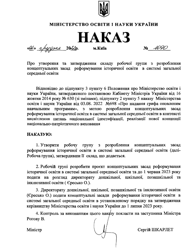 Керівництво МОН розгляне концептуальні засади реформування історичної освіти в системі загальної середньої освіти до 1 липня 2023 року