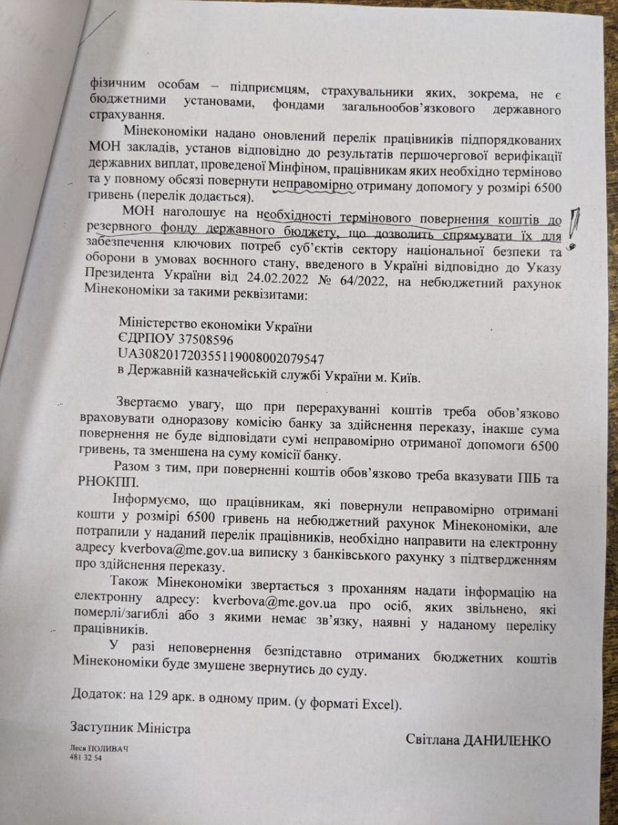 «Мінекономіки надано оновлений перелік працівників підпорядкованих МОН закладів, установ відповідно до результатів першочергової верифікації державних виплат, проведеної Мінфіном, працівникам яких необхідно терміново та у повному обсязі повернути неправомірно отриману допомогу у розмірі 6500 гривень (перелік додається)», - сказано у повідомленні.