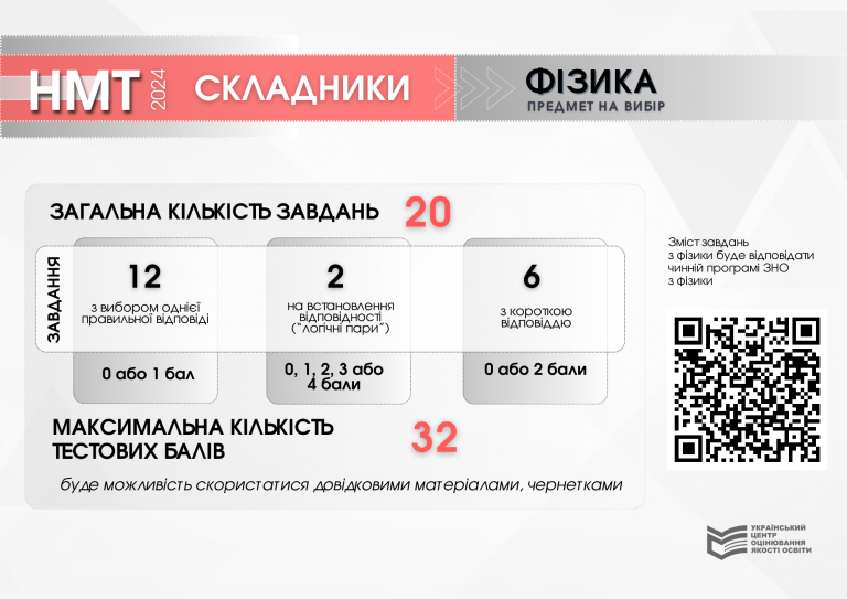 Із фізики буде 20 завдань, із яких 12 із вибором однієї правильної відповіді, два на встановлення відповідності (логічна пара) і шість із короткою відповіддю, за які можна заробити 32 тестових бали.