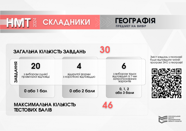 З географії буде 30 завдань, із яких 20 з вибором однієї правильної відповіді, чотири з короткою відповіддю та шість із вибором трьох відповідей із семи запропонованих, за які можна заробити 46 тестових балів.