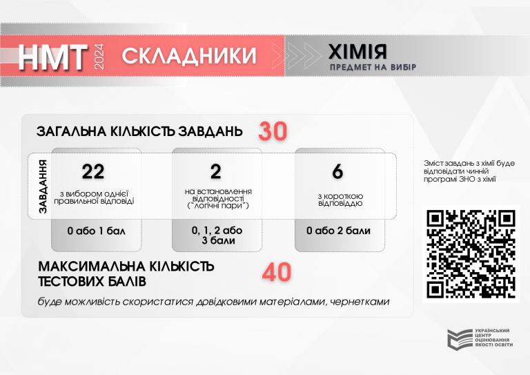 З хімії буде 30 завдань, із яких 22 із вибором однієї правильної відповіді, два на встановлення відповідності (логічна пара) та шість з короткою відповіддю, за які можна заробити 40 тестових балів.