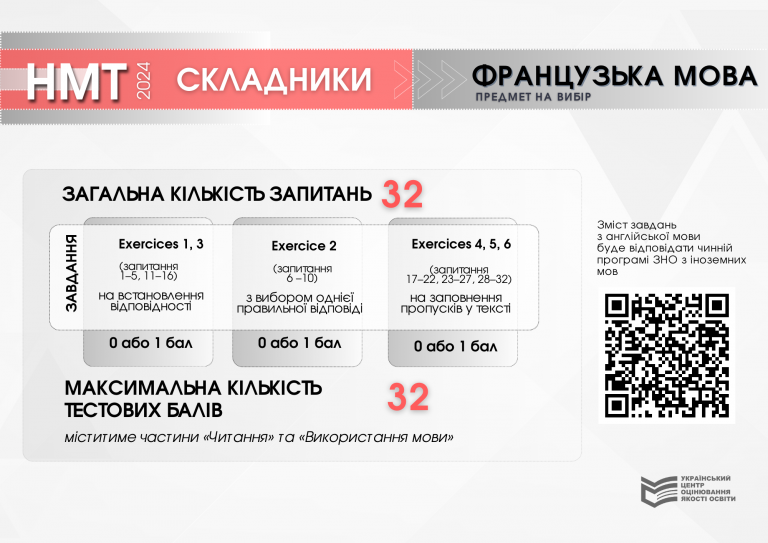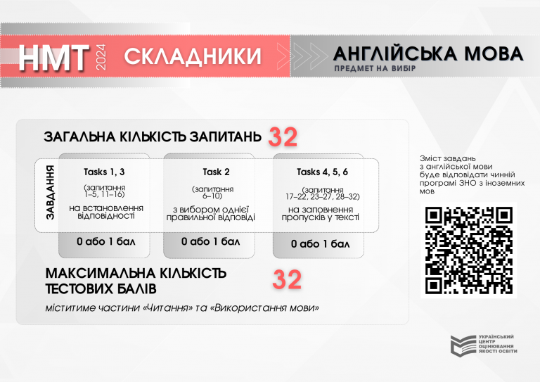 З іноземних мов буде 32 завдання, з яких 11 на встановлення відповідності, п'ять із вибором однієї правильної відповіді та 16 на заповнення пропусків у тексті, за які можна заробити 32 тестових бали.