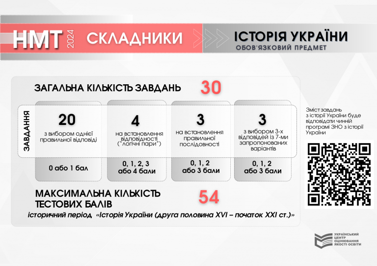 З історії України буде 30 завдань, із яких 20 із вибором однієї правильної відповіді, чотири на встановлення відповідності (логічна пара), три зі встановленням правильної послідовності та три з вибором трьох відповідей із семи запропонованих, за які можна заробити 54 тестових бали.