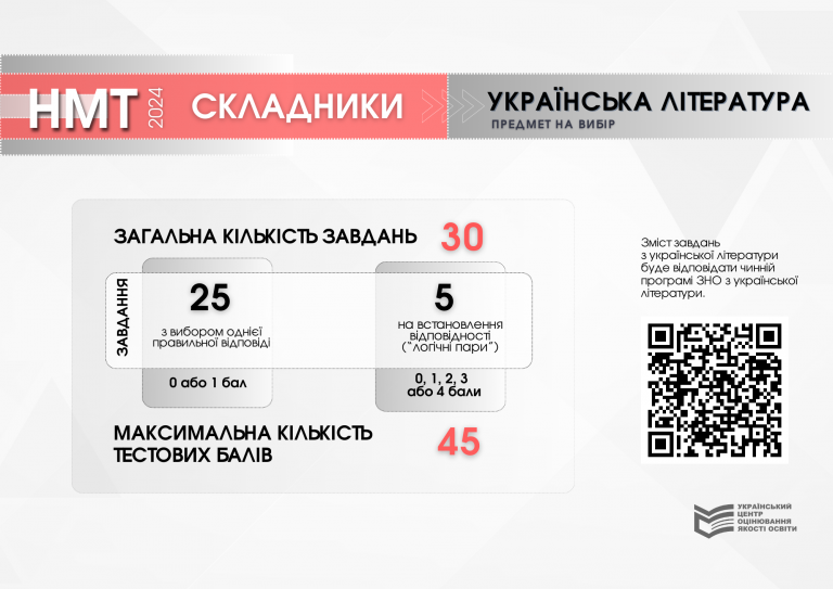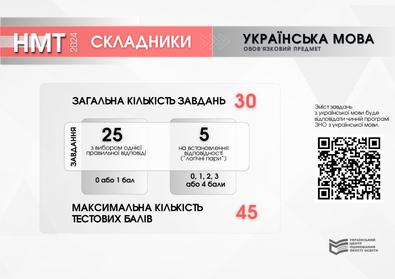 З української мови та української літератури буде по 30 завдань, з яких 25 із вибором однієї правильної відповіді та п'ять на встановлення відповідності (логічна пара), за які можна заробити по 45 тестових балів.