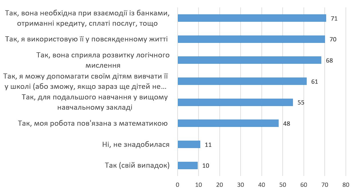 Відповіді показують, що математика була не потрібна лише 11% респондентів, 89% зазначили, що в тій чи іншій мірі вона була потрібна. Три головні випадки застосування математики - при взаємодії із банками, отриманні кредиту, сплаті послуг тощо (71%), використання у повсякденному житті (70%) і вплив на мислення (68% респондентів вважають, що математика сприяла розвитку їх логічного мислення), різниця між цими трьома пунктами незначуща. Два інших випадки застосування математики – допомога дітям у навчанні (61%) і для подальшого навчання у виші (55%). І, нарешті, 48% опитаних безпосередньо використовують математику у своїй роботі.