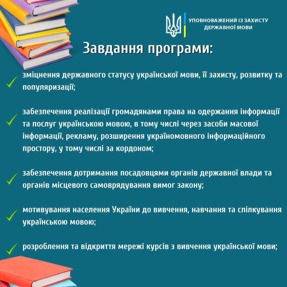 - забезпечення реалізації громадянами права на одержання інформації та послуг українською мовою, в тому числі через засоби масової інформації, рекламу, розширення україномовного інформаційного простору, у тому числі за кордоном;