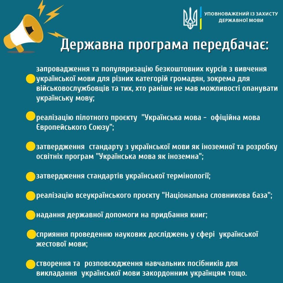 - запровадження та популяризацію безкоштовних курсів, зокрема, онлайн,  з вивчення української мови для різних категорій громадян, в тому числі для ветеранів війни, членів їх сімей, членів сімей загиблих (померлих) ветеранів війни, загиблих (померлих) Захисників і Захисниць України, а також громадян, які не вивчали українську мову;