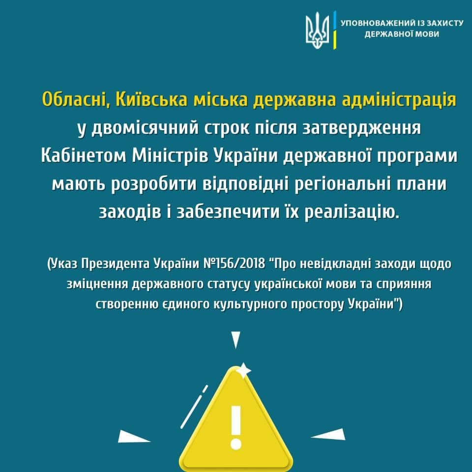 Відповідно до Указу Президента України №156/2018 «Про невідкладні заходи щодо зміцнення державного статусу української мови та сприяння створенню єдиного культурного простору України» обласні, Київська міська державна адміністрація у двомісячний строк після затвердження Кабінетом Міністрів України державної програми зобов’язані розробити відповідні регіональні плани заходів і забезпечити їх реалізацію.